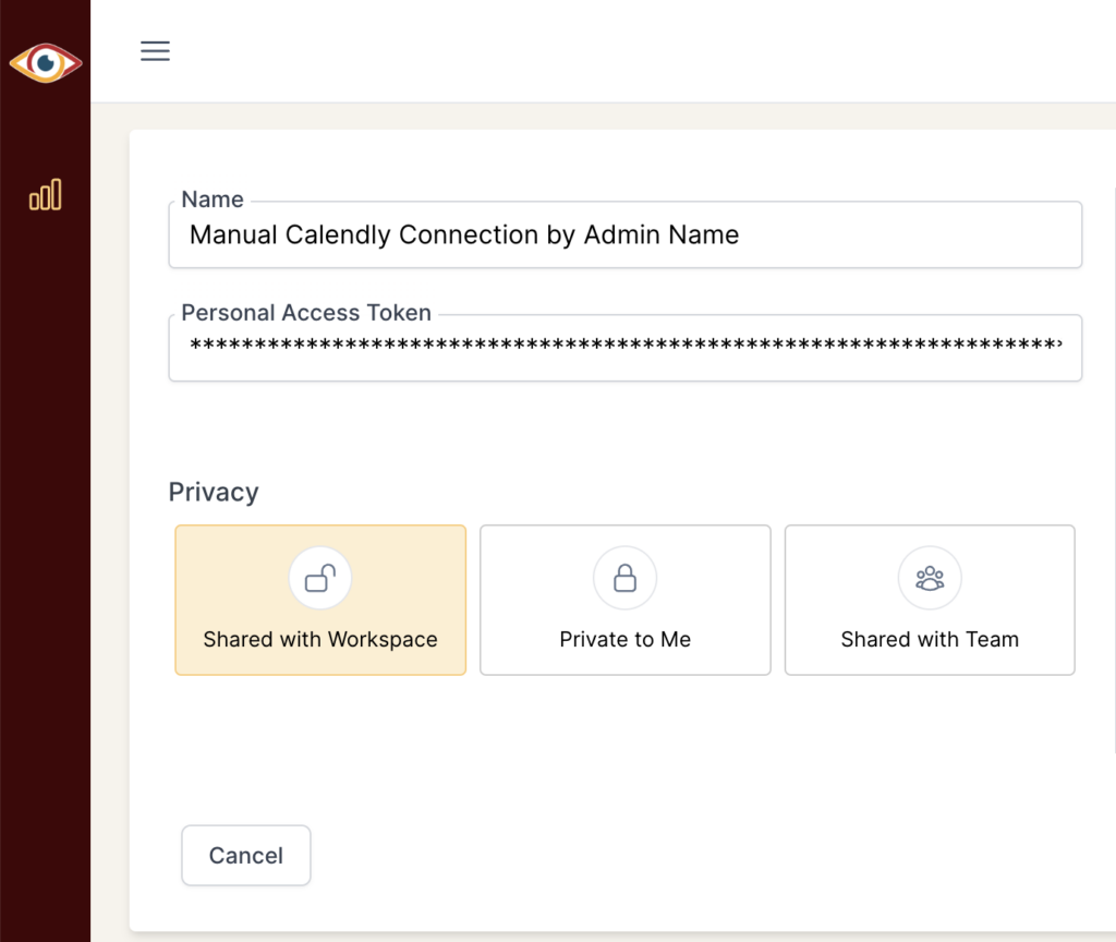 - Select the Privacy level for the connection (you can edit this later, too): Shared with Workspace, Private to Me, or Shared with Team.