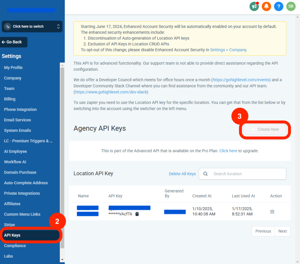 Agency API Keys are only available to the GoHighLevel Agency Pro or SaaS Pro plans.