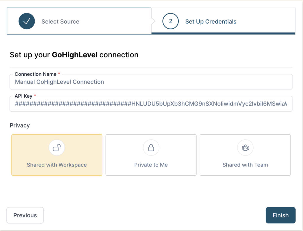 - Select the Privacy level for the connection (you can edit this later, too): Shared with Workspace, Private to Me, or Shared with Team.