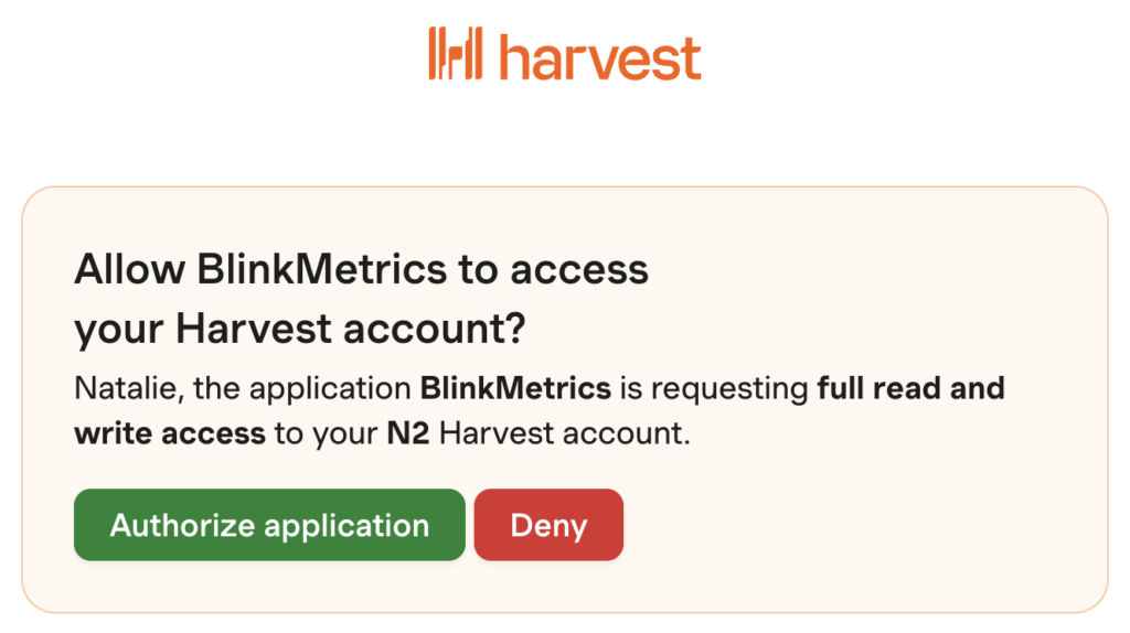 - The application BlinkMetrics is requesting full read and write access to your Harvest account.