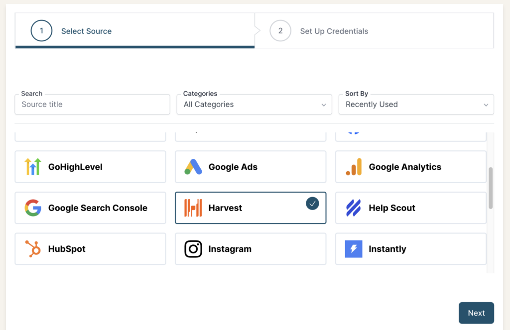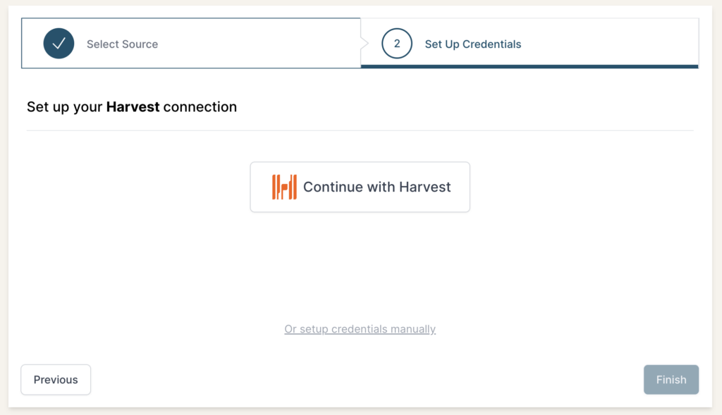 From the Connection Stepper interface, select Harvest in the Select Source tab. In the Set Up Credentials tab, click the Continue with Harvest button.