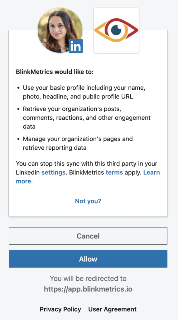 When you’re done, click Allow. You’ll be redirected back to BlinkMetrics when you’re done.