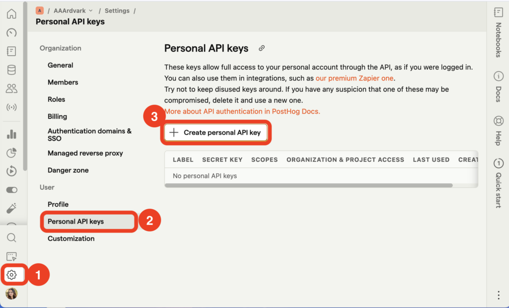 To create a connection with BlinkMetrics, we’ll need to collect the API Key from your PostHog account. Navigate the PostHog account dashboard: