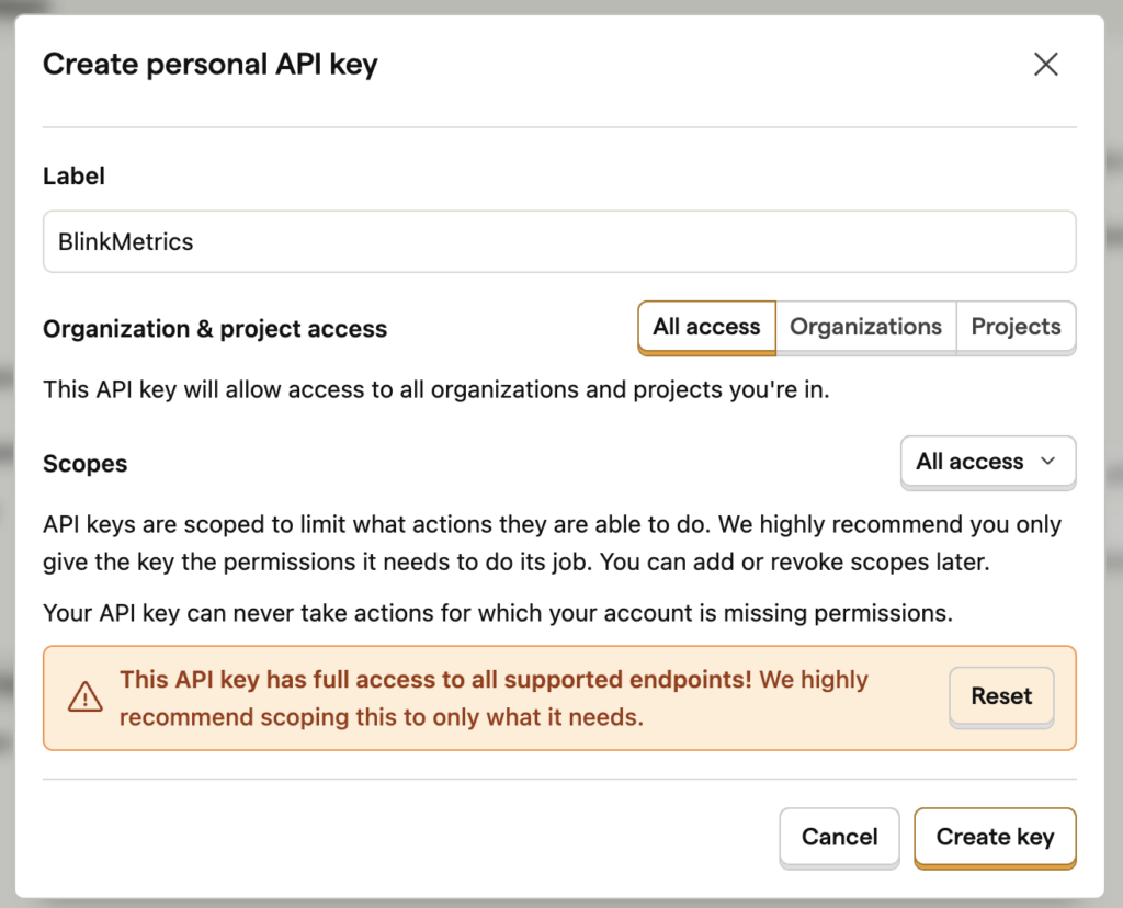 - Click the Create personal API Key button, which’ll open a popup where you’ll need to: