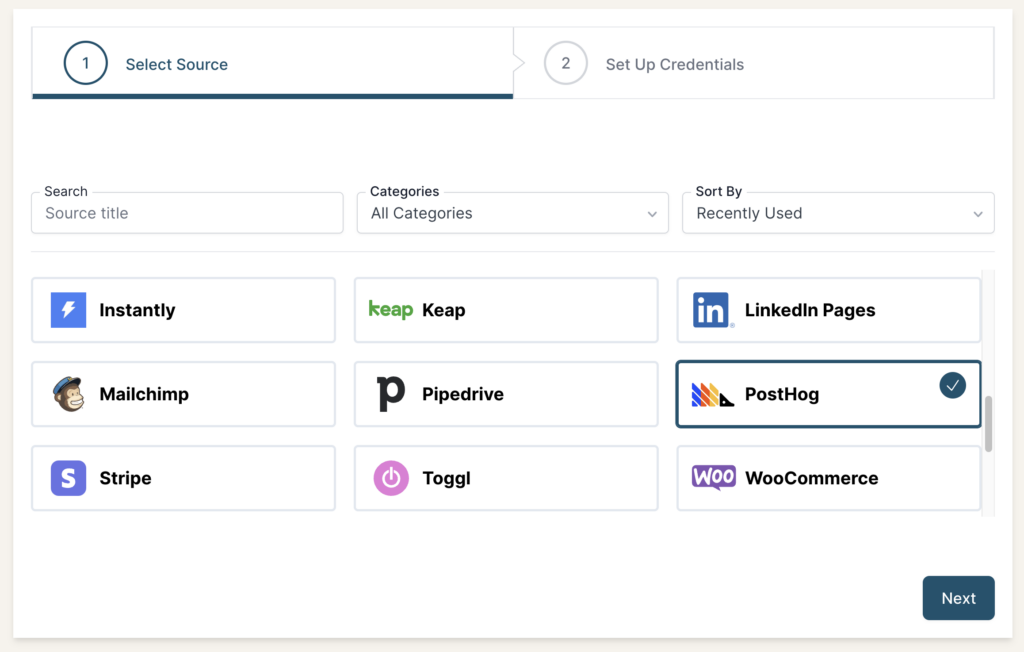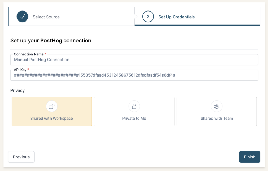 From the Connection Stepper interface, select PostHog in the Select Source tab. In the Set Up Credentials tab, you’ll see a few fields that we need to fill in. Open a new tab and go to the next step in the guide. Don’t close this tab, though; we’ll need to return to this BlinkMetrics page in Step 4 below.