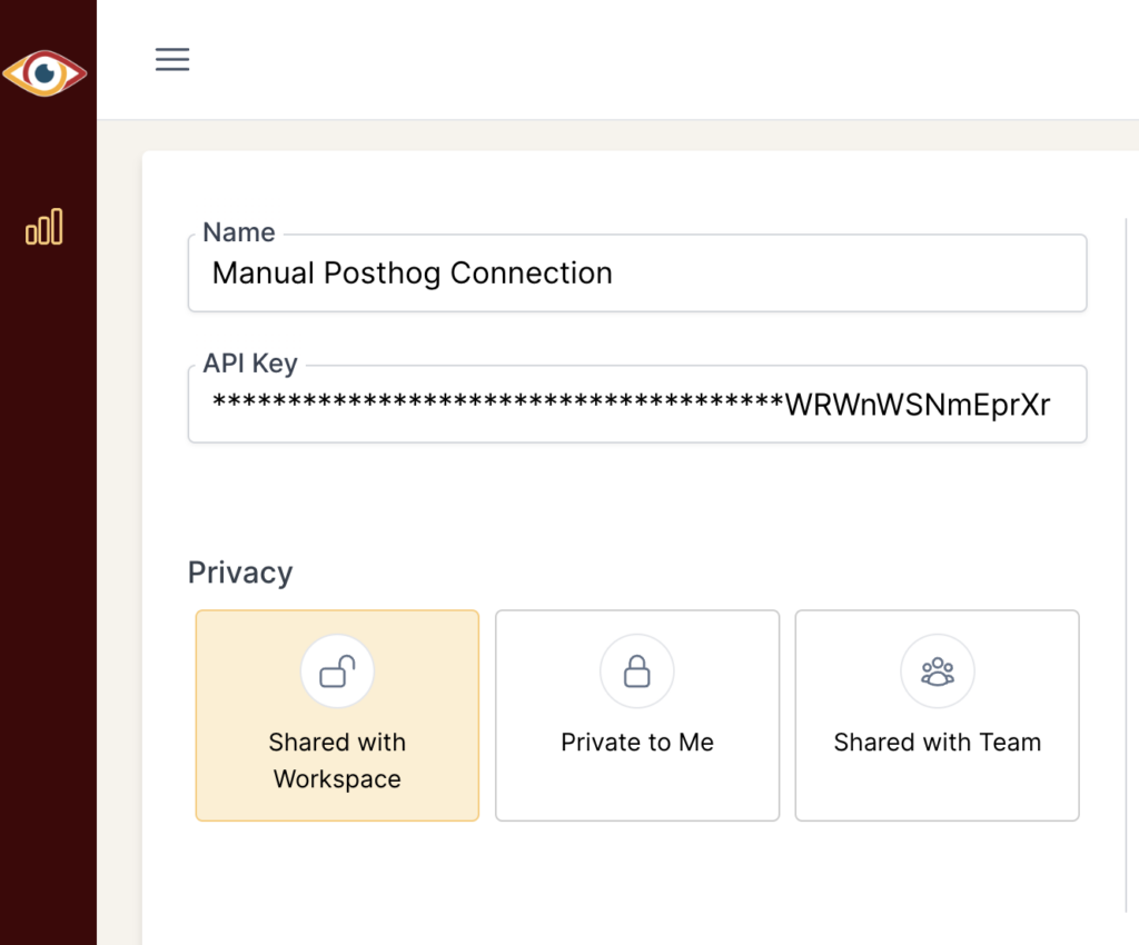 - Select the Privacy level for the connection (you can edit this later, too): Shared with Workspace, Private to Me, or Shared with Team.