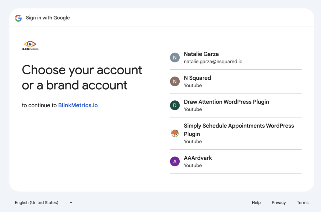 - Make sure to select the account that owns the YouTube channel you’d like to connect with BlinkMetrics.