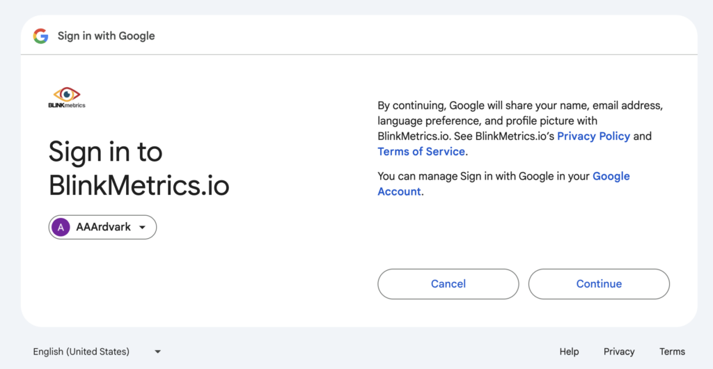 - Next, agree and click Continue to Sign in to BlinkMetrics.io.